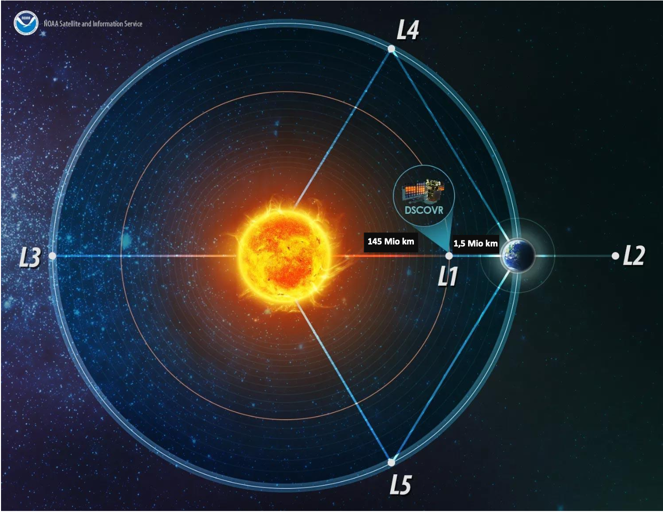 To strengthen topics from the Earth-Moon system in connection with remote sensing in school lessons, students will explore the Deep Space Climate Observatory (DSCOVR) and its special positioning at Lagrange point L1 between Earth and Sun in this teaching unit. The DSCOVR satellite, positioned 1.5 million kilometers from Earth exactly on the connecting line between Earth and Sun, offers the unique possibility to display global images of the permanently sun-illuminated side of Earth. In this module, students investigate phenomena such as solar eclipses, lunar flybys, the effects of Earth's axial tilt on seasons, the impacts of forest fires and climate change, as well as the positioning of satellites at Lagrange point L1 between Earth and Sun and the advantages and disadvantages that come with it.
